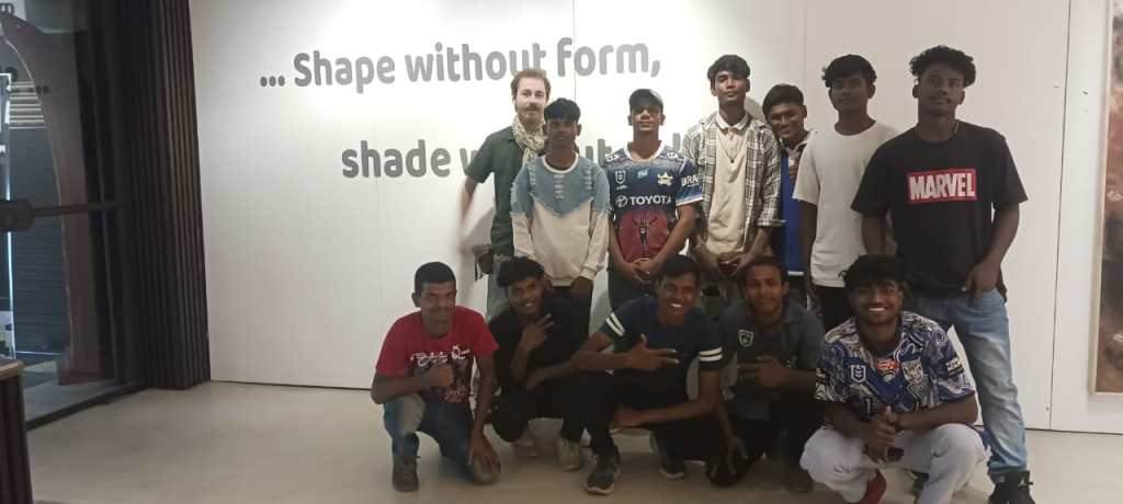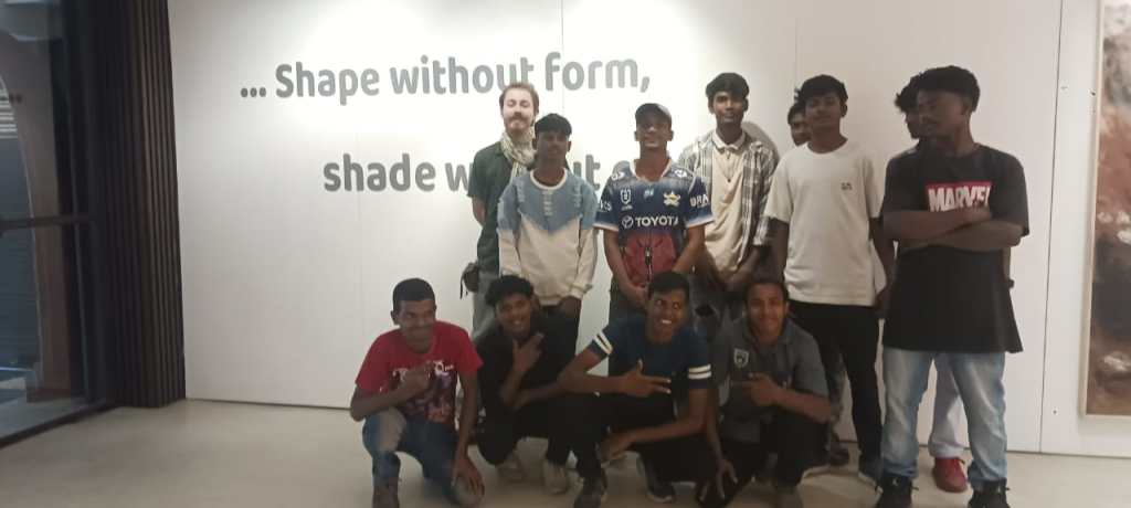 François avait préparé une sortie très intéressante pour les jeunes menuisiers d’Asha Tici. Le but principal était d’aller à la galerie Cima, qui est essentiellement un espace dédié à l’art contemporain. Nous y découvririons une exposition temporaire intitulée Formes sans formes, ombres sans couleurs. Nous étions là pour la visite de cette exposition gratuite qui permettrait à ces jeunes de plonger dans le monde fascinant de l’art contemporain indien. Malgré sa taille relativement réduite, la galerie offre une expérience riche et remplie de découvertes.
